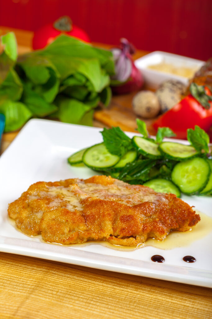 Paniertes Schnitzel vom Schwein, dazu verschiedene frische Saucen