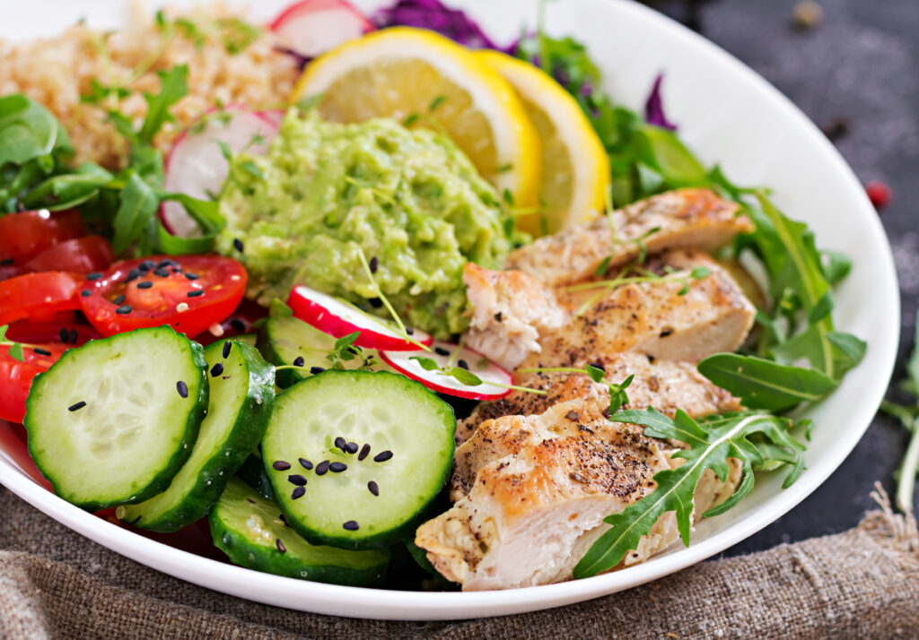 Bunter gemischter Salatteller mit gebratenen Hähnchenbruststreifen