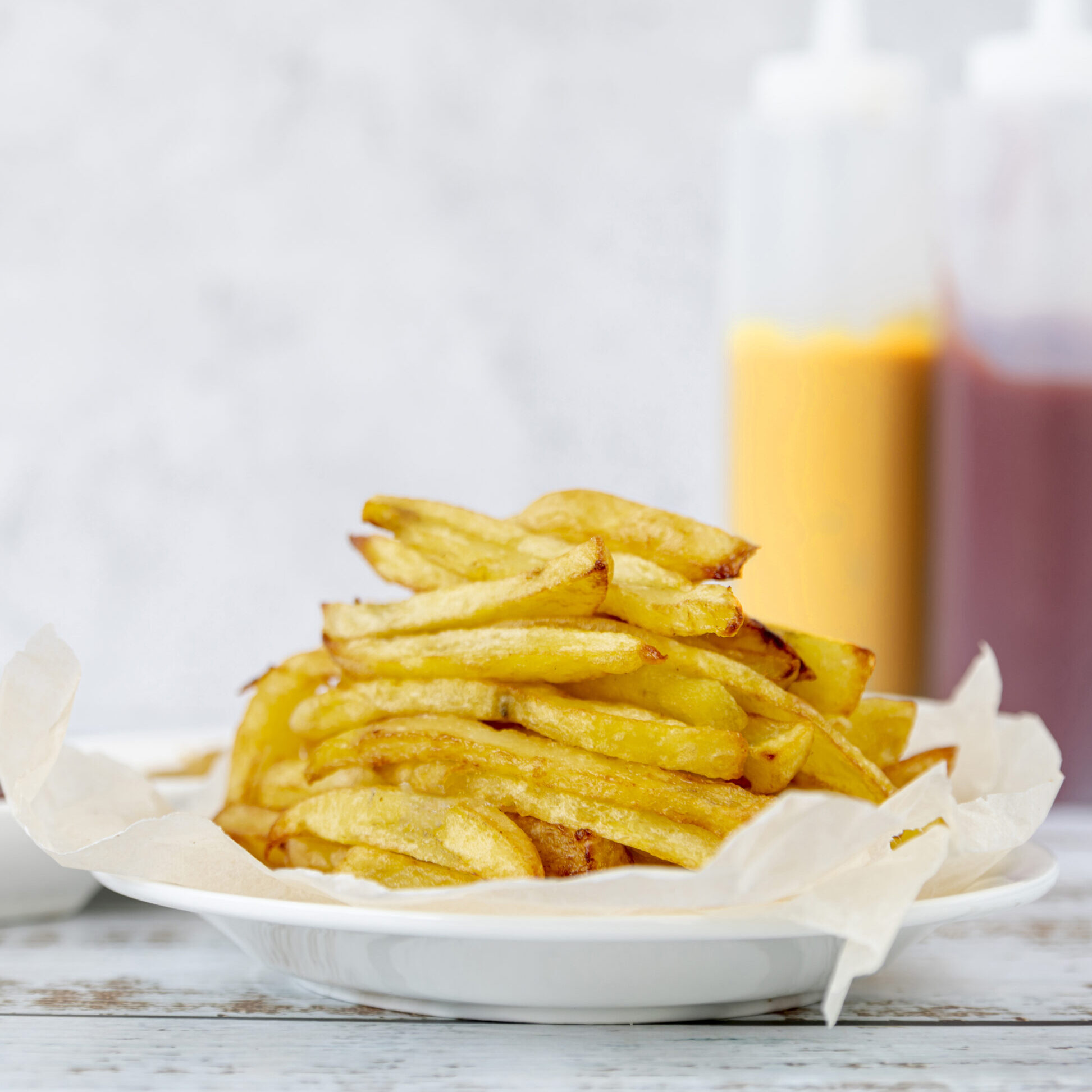 Bratwurst mit Pommes frites, Ketchup & Mayoonnaise