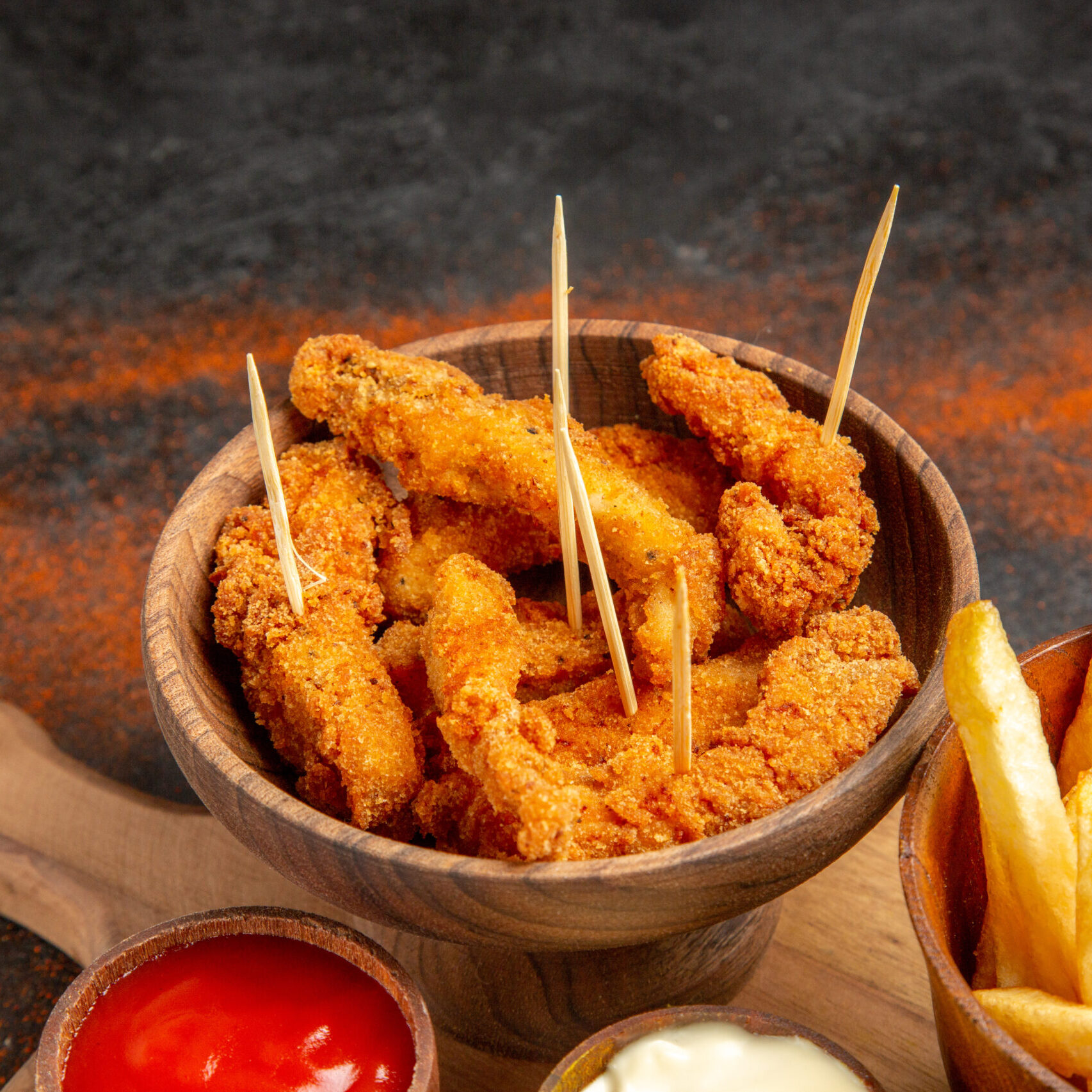 Schnitzelchen mit Pommes frites, Ketchup & Mayonnaise